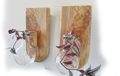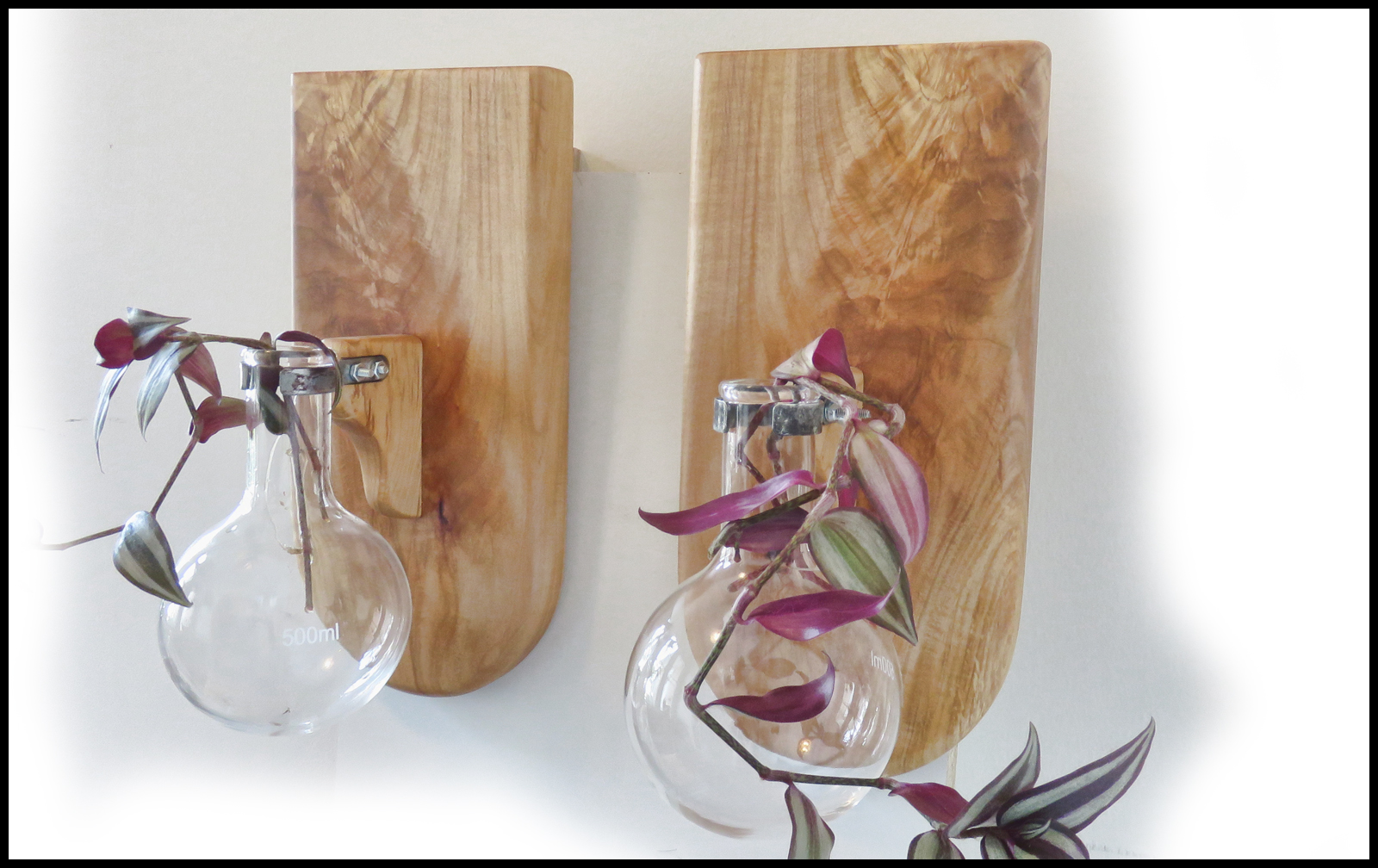 A bookmatched pair of hanging planters. Each holds a 500ml, 4" inch wide by 7" high round bottom flask. Approximate size is 6.5" wide x 14" high x 3/4" thick.